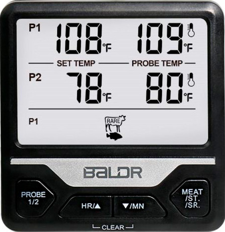 Термометр BALDR B0373T2 – продуманный до мелочей кухонный прибор для духовки, гриля и коптильни с 2 независимыми стальными зондами длиной 4,72 дюйма. 2 датчика позволяют одновременно контролировать температуру в нескольких местах: например, сердцевины 2 разных продуктов одновременно или сам продукт и общую температуру в духовом шкафу – все без перестановки зондов и без использования второго прибо
