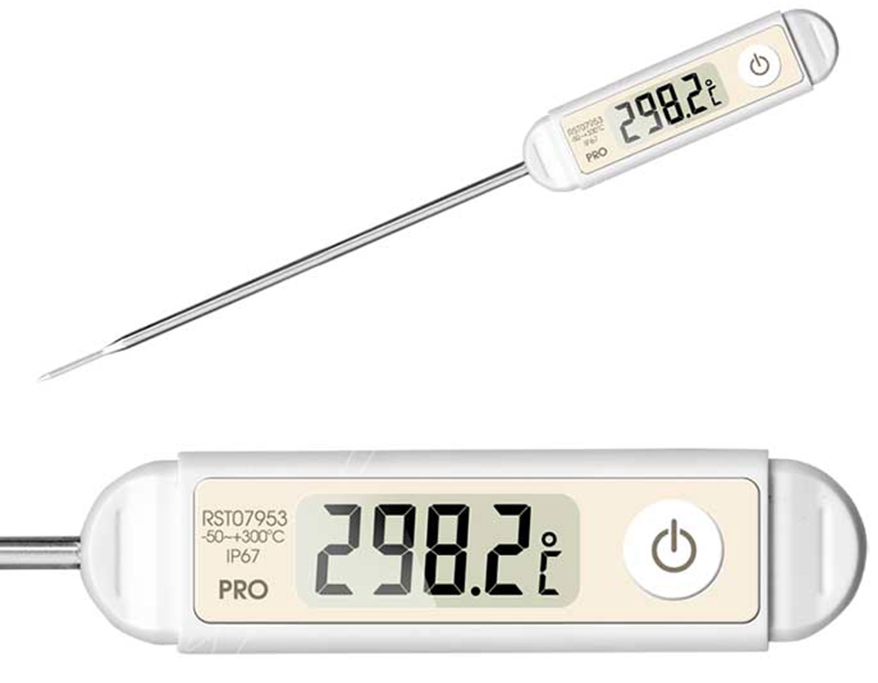 Модель RST 07953 – это термометр кулинарный с щупом, купить который можно и для домашнего, и для профессионального использования: он измеряет температуру до 300 °C включительно. Выносной термосенсор прибора располагается на конце стального стержня. Сенсор водонепроницаем, а для измерения температуры ему достаточно секундного погружения. Такой термощуп поможет контролировать любой кулинарный проце