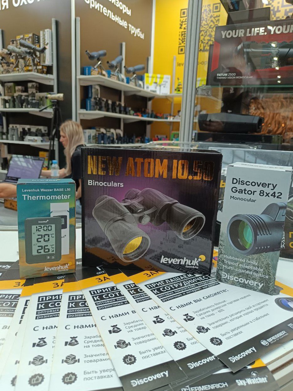 Главным элементом стенда, как мы и обещали, стала масштабная экспозиция оптических приборов брендов Levenhuk, Discovery, Bresser и Sky-Watcher. Нам было приятно видеть, как оживали наши продукты в руках посетителей: охотники тестировали монокуляры и тепловизоры, а путешественники с интересом примерялись к биноклям и зрительным трубам. Прагматичных гостей, как мы и предполагали, привлекли точные измерительные инструменты Ermenrich, которые вызвали оживленные дискуссии о их применении в строительстве и ремонте, особенно среди посетителей-мужчин.