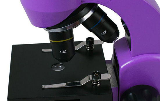 Микроскоп комплектуется стеклянными объективами с увеличением 4x, 10x и 40x, которые сменяются поворотом револьверной головки. В комплекте также идет линза Барлоу 2x, удваивающая любое из этих увлечений. Как заявляет производитель, максимальное увеличение из коробки составляет 800х.