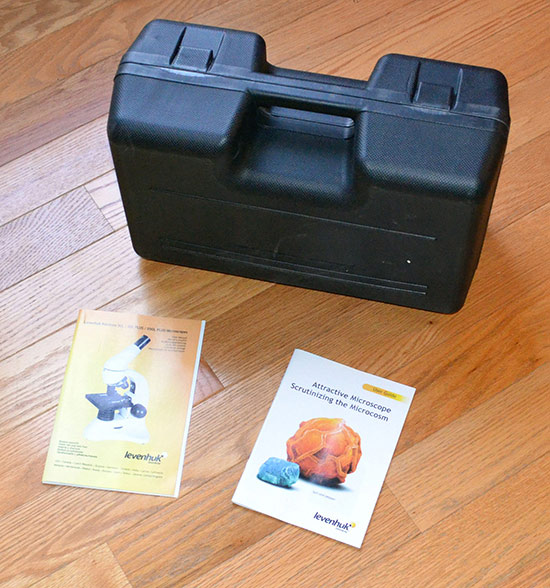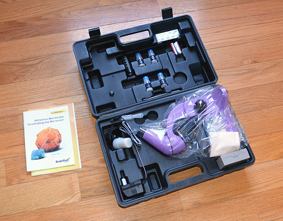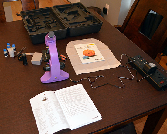 Легкий микроскоп с корпусом из пластика поставляется в большом пластиковом кейсе. Внутри вы найдете множество полезных аксессуаров, набор для опытов Levenhuk K50, а также инструкцию по эксплуатации. Я получил данный микроскоп в фиолетовом цвете (аметист), но он доступен и в других, не менее смелых, оттенках: апельсин, лайм, лазурь (голубой), и лунный камень (белый).