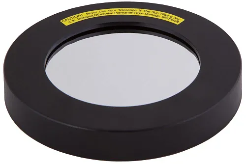 Фильтр изготовлен из астрономической пленки, которая отражает 99,999% вредного для глаз излучения. Коэффициент светопропускания составляет 0,001%. Солнце будет нейтрально-белого цвета. Устанавливать светофильтр можно на любые зеркально-линзовые телескопы с апертурой 90 мм.