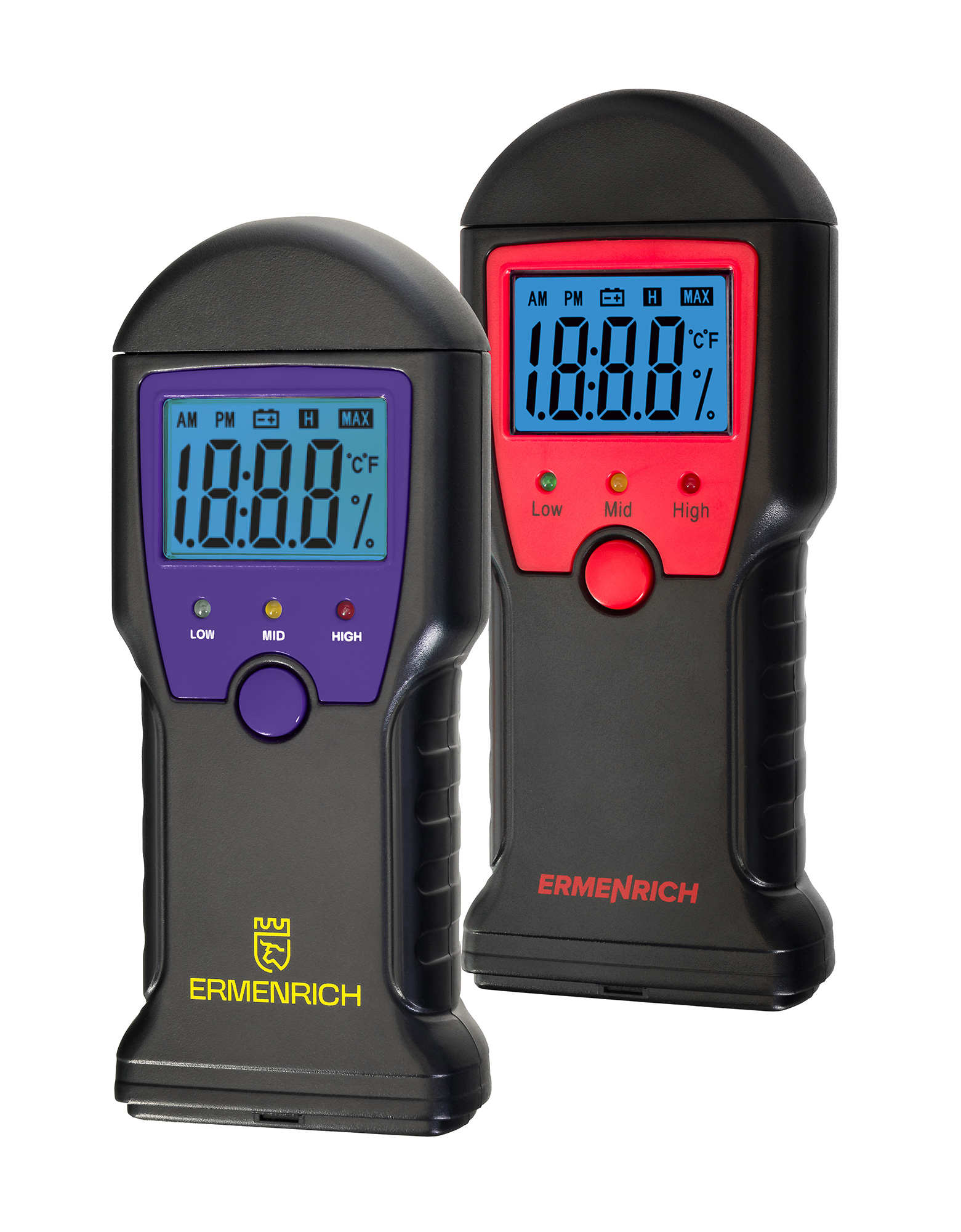 Датчик влажности (влагомер) Ermenrich Wett MW10 – портативный измерительный инструмент, который определяет уровень влажности разных материалов: в первую очередь сделанных из древесины, но также и предназначенных для строительных работ (растворов, смесей и проч.). Он работает по контактной технологии, т. е. имеет пару игольчатых сенсоров, которые и проводят замеры. Также прибор может определять температуру.