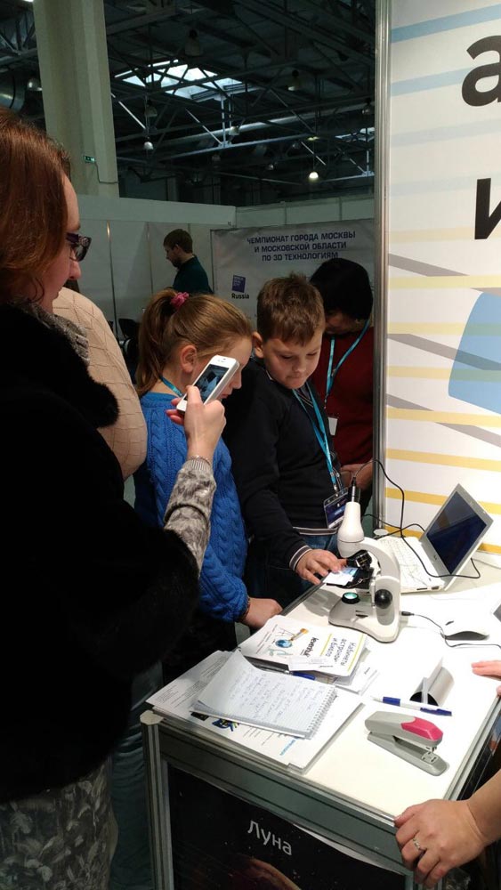 На выставке мы представляем оптическую технику трех брендов: Levenhuk, Bresser и Sky-Watcher. Сегодня мы проводим демонстрации микроскопа Levenhuk D50L, протестировать который могут все желающие.